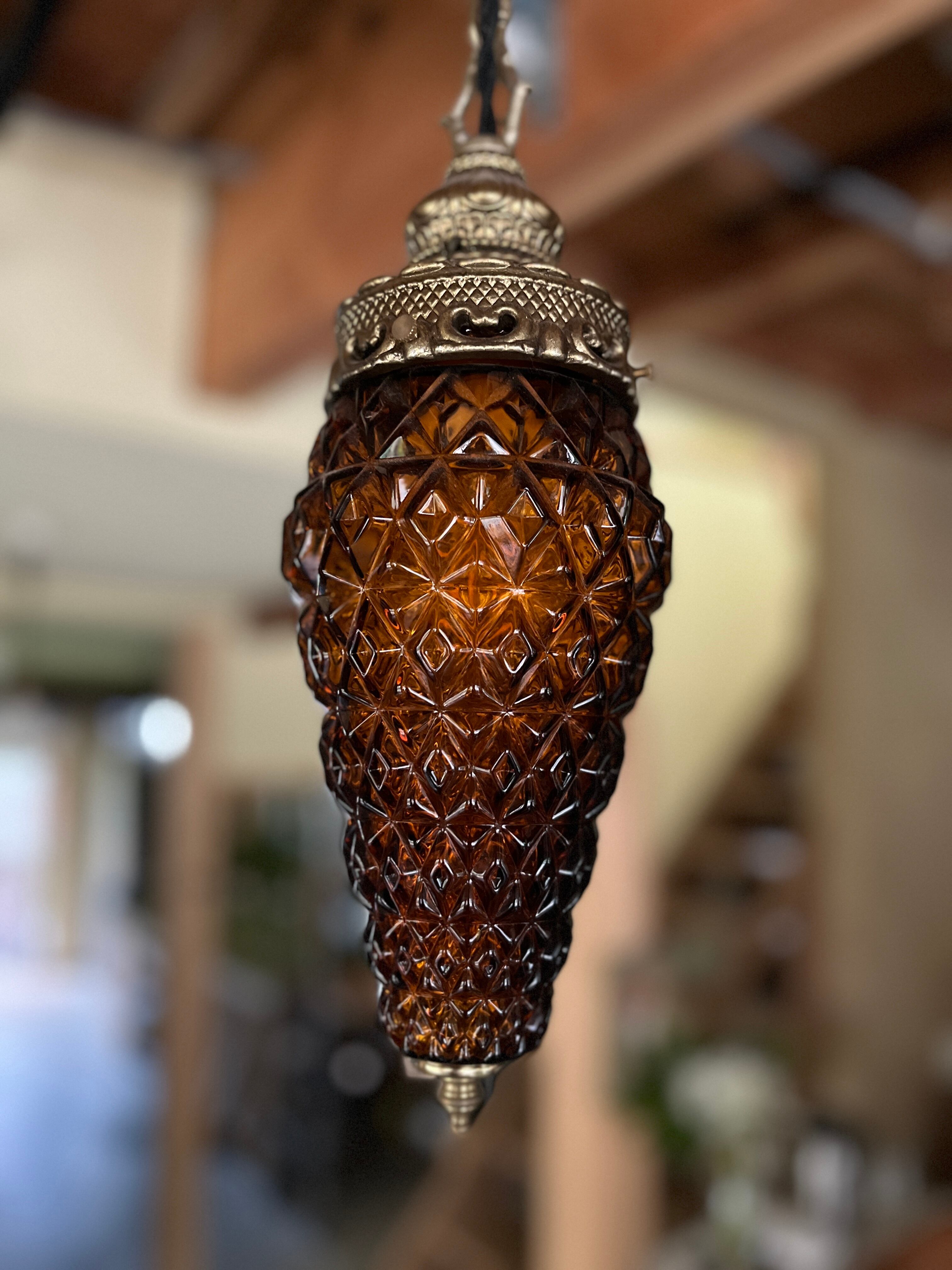 松ぼっくりのような形をした茶色いガラスのアンティーク風ランプです。お部屋のアクセントにピッタリ。